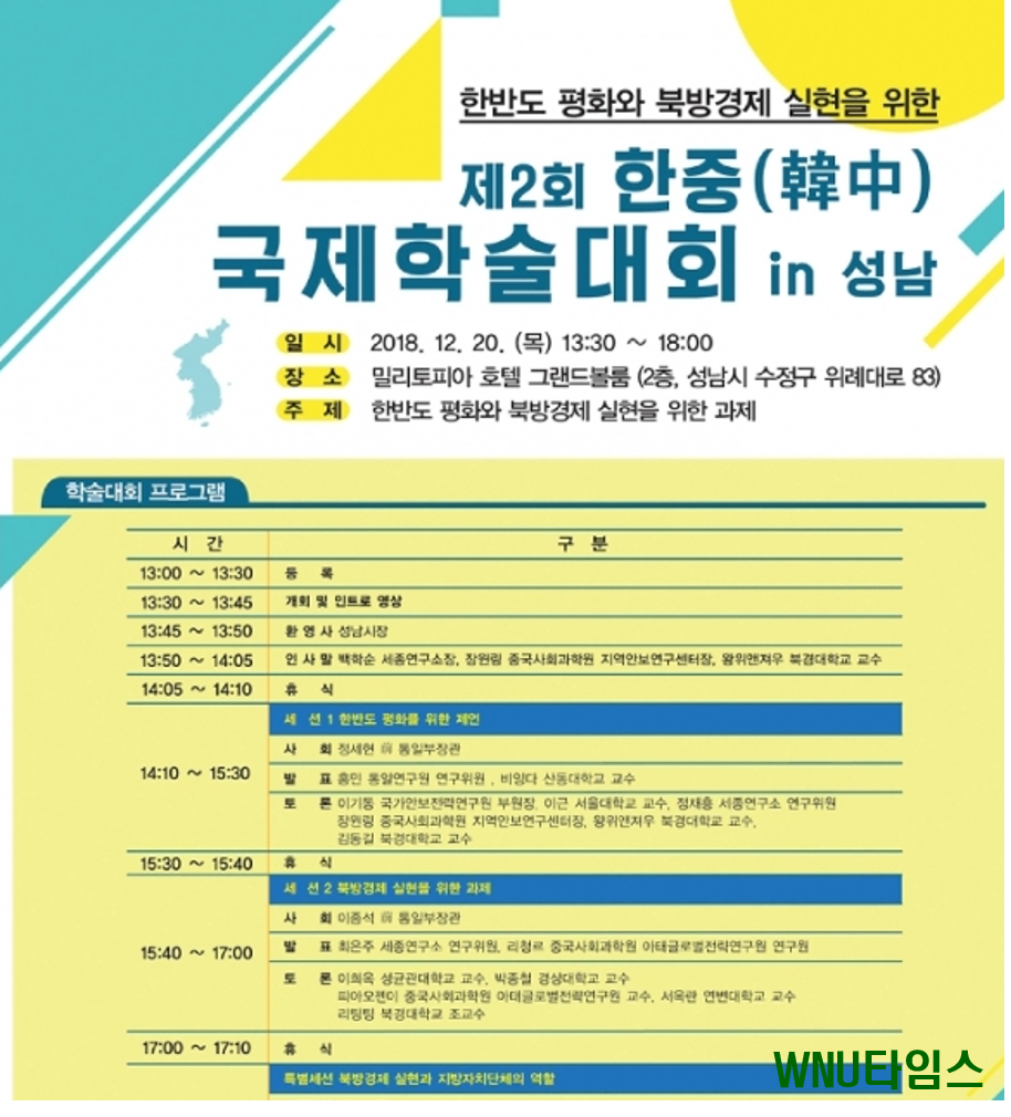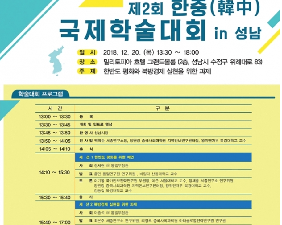성남시(시장 은수미)와 세종연구소, 중국사회과학원 지역안보연구센터, 북경대학교(베이징대학교) 한반도연구센터가 공동 주최하는 이날 행사는 한반도 평화와 북방경제 실현 과제 모색을 위해 마련된다.