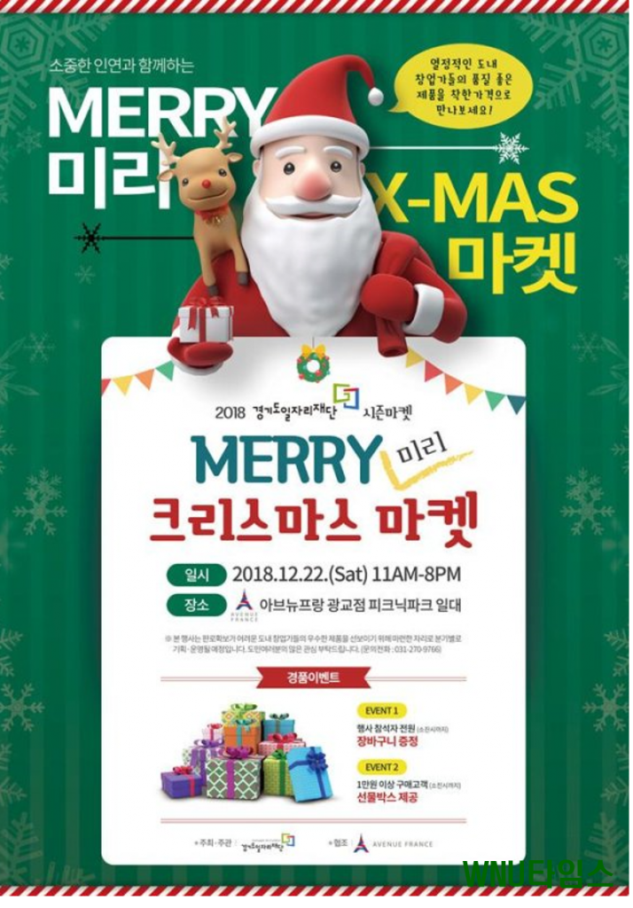 경기도일자리재단은 오는 22일 오전 11시부터 아브뉴프랑 광교점에서 창업기업을 위한 시즌마켓 ‘미리 MERRY 크리스마스 마켓’을 개최한다고 21일 밝혔다.